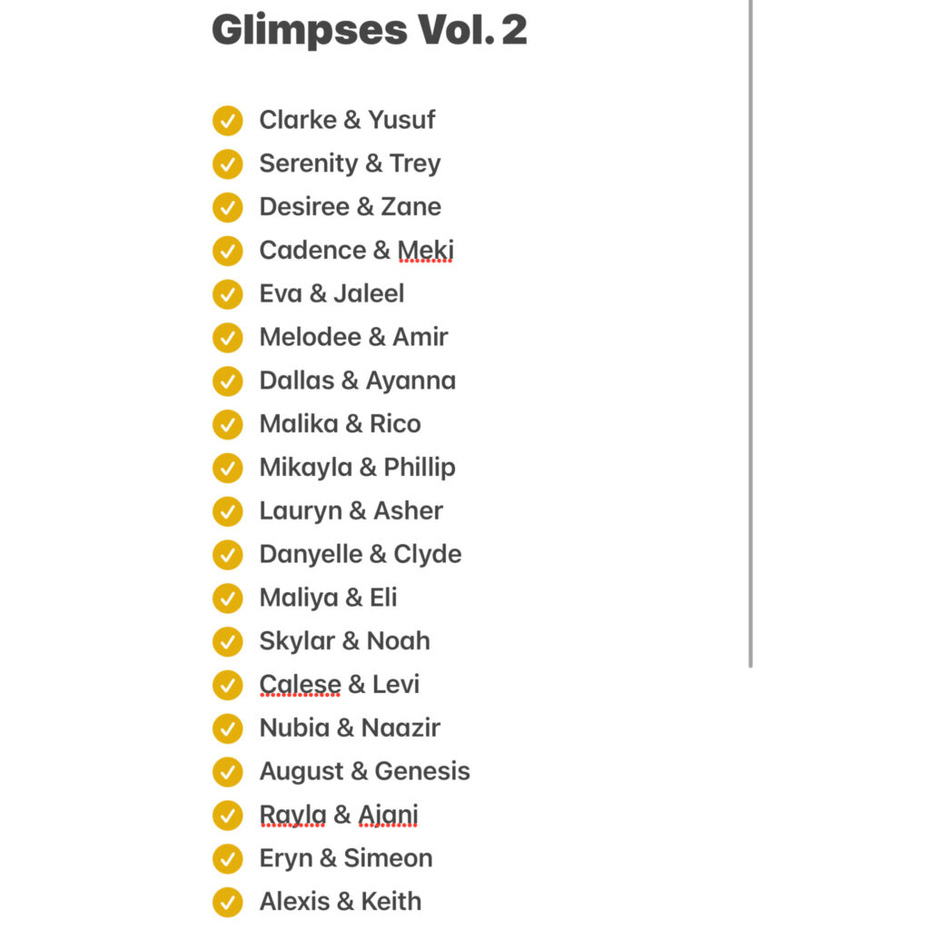 If this is your first introduction to my Glimpses, you can download Vol. 1 right now on ByBrookelynMosley.com. See if any familiar names are in there!